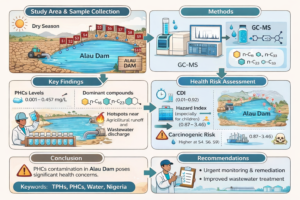 Petroleum hydrocarbons (PHCs) are persistent pollutants with serious ecological and health implications, especially in oil-impacted aquatic systems. This study evaluated the concentration, distribution, and health risks of PHCs in dry-season water samples from Alau Dam, Konduga LGA, Borno State, Nigeria. Water from ten sampling points S1–S10 was analyzed using GC–MS. PHCs concentrations ranged from 0.001 to 0.457 mg/L, with elevated levels near agricultural runoff and wastewater discharge areas. Dominant compounds included n-alkanes such as n-C16, n-C23, and n-C33. CDI values ranged from 1.12 × 10⁻⁵ to 8.43 × 10⁻³ mg/kg/day. Hazard Quotients (0.01–0.92 suggested low individual risk; however, cumulative Hazard Index values exceeded safety limits at several sampling points, particularly for children 0.87–3.46. Carcinogenic risks were above USEPA limits, with higher risks at S4, S6, and S9. Overall, PHCs contamination poses significant health concerns, warranting urgent monitoring and remediation.